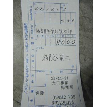 柳谷竜二が募金ボトルの中身を確認した所、7千円と小銭が幾つかあっので半端に自分の寄付金として足して千円にし、合計8千円の義援金として21日の月曜日に全額を、福島県妨害対策本部宛てに寄付いたしました。 みなさんのご協力誠に感謝いたします。ありがとうございました。